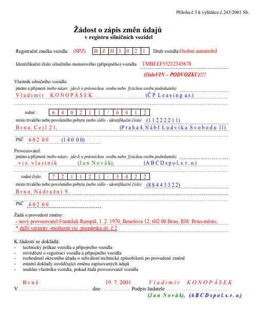 - vyplnění žádosti o přepis vozidla